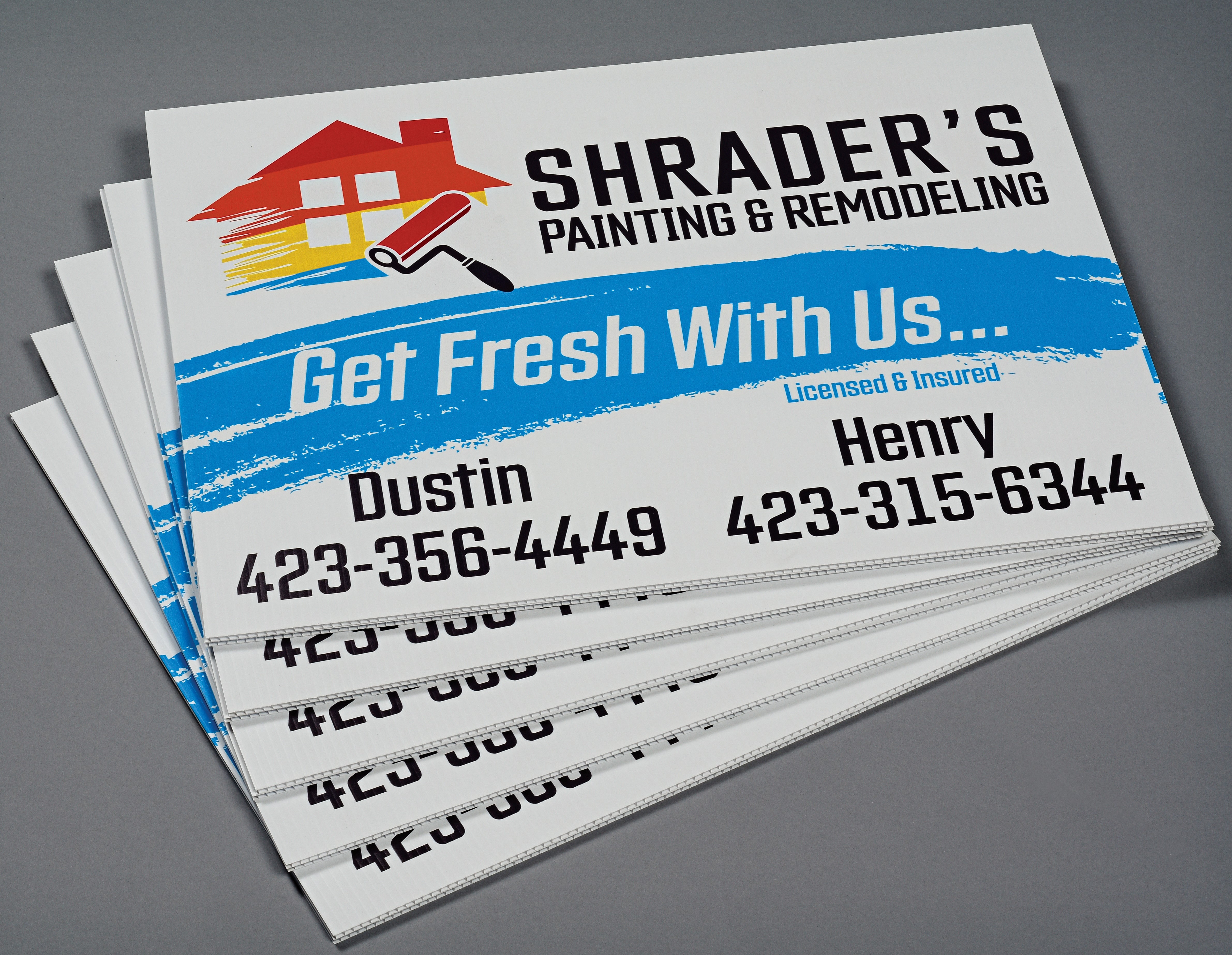 Coroplast signs for everyday advertising (typically 18" x 24", 12" x 18"). "A frame" signs are standard 24" x 36"